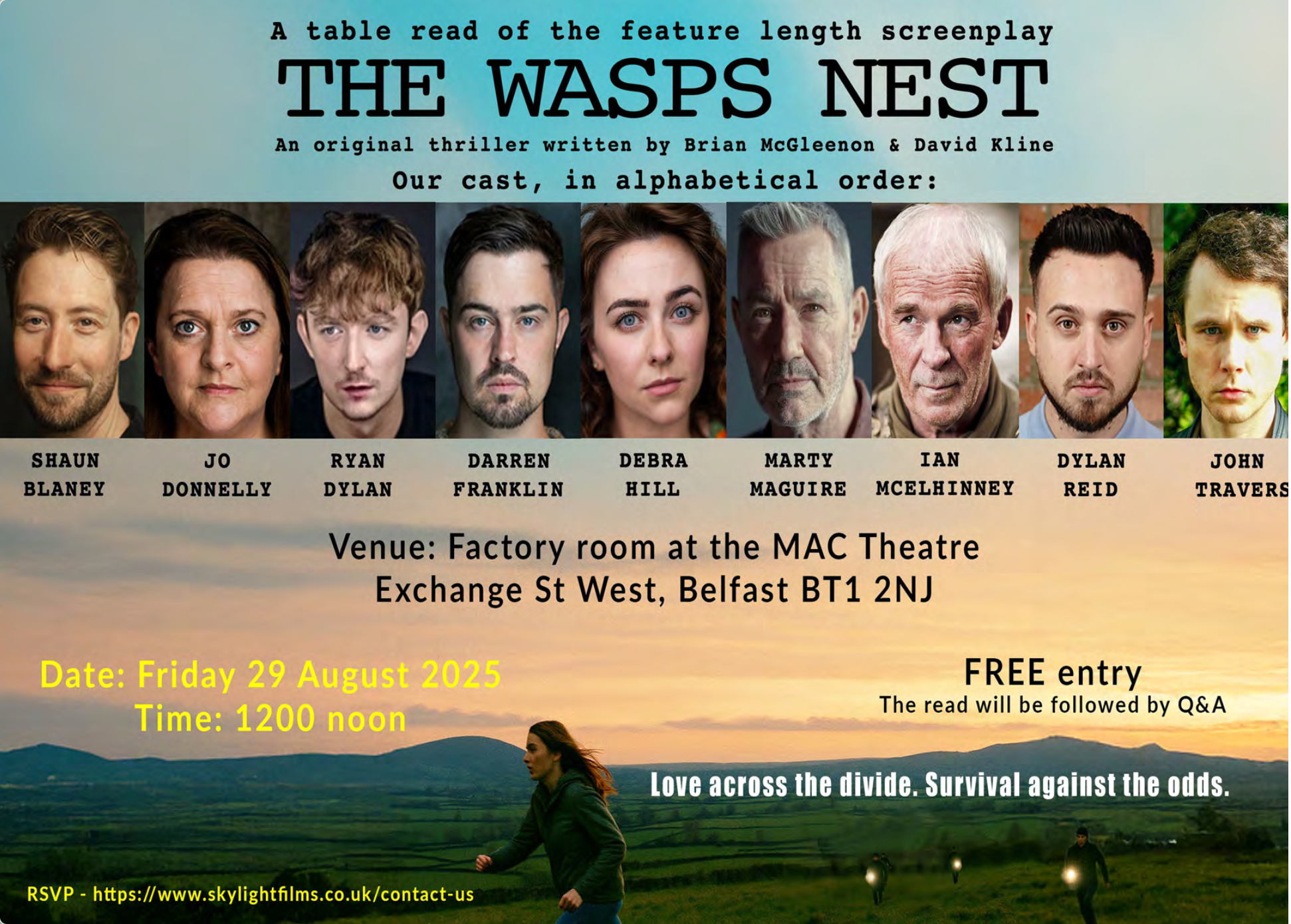 We had an excellent day in Belfast at the MAC on Fri 29 Aug, for the table read of The Wasps Nest the new feature film (thriller) written by Brian McGleenon and David Kline. A brilliant cast of actors who brought the script to life for the audience.